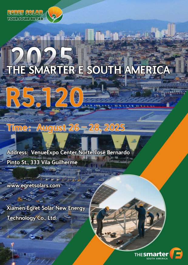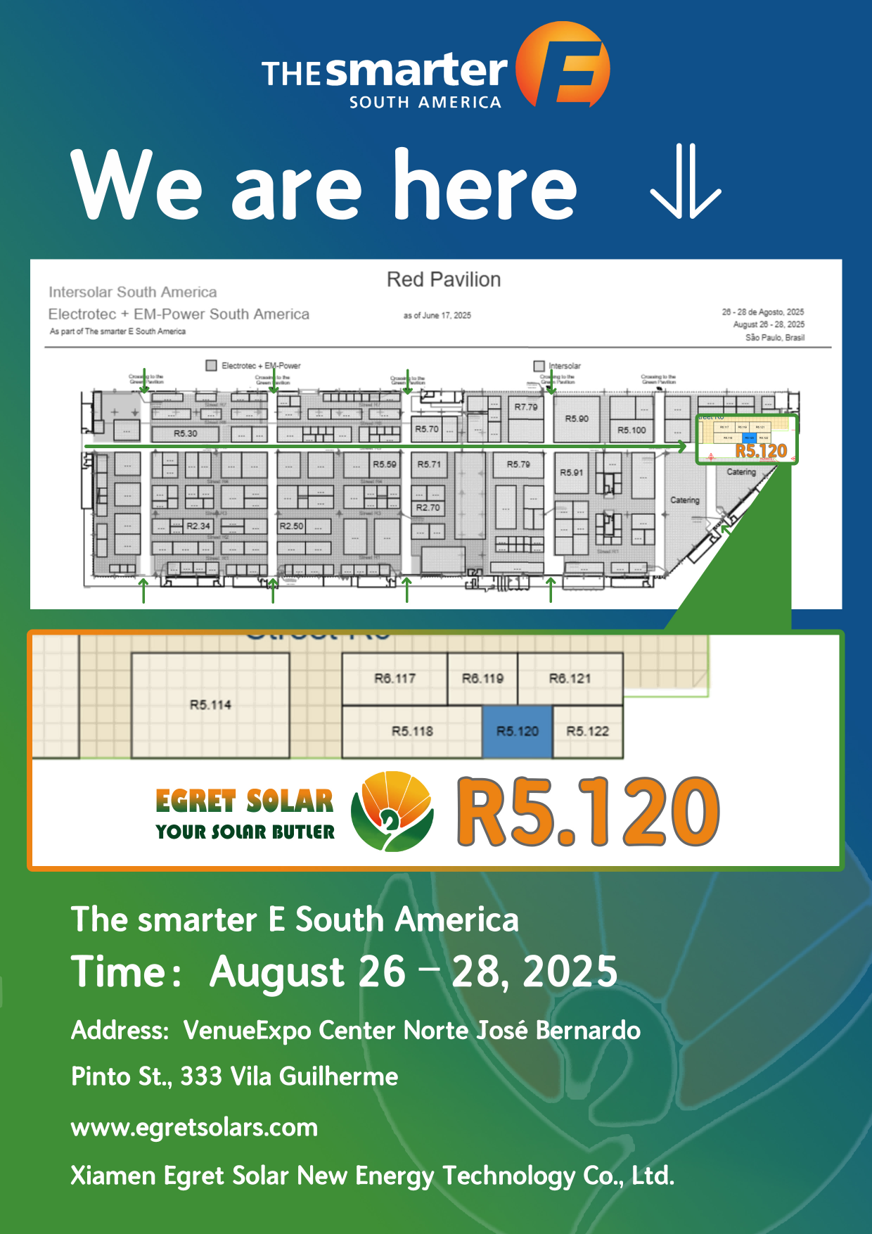 Како клучен играч во новиот енергетски сектор,Xiamen Egret Solar New Energy Technology Co., Ltd.ќе ги покаже своите основни производи и технички решенија на изложбата Попаметен Е Јужна Америка 2025 во Бразил од 26-28 август 2025 година, за да разговара за развојот и соработката на јужноамериканскиот нов пазар на енергија со глобалните партнери во индустријата.